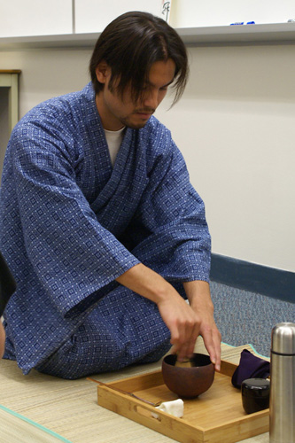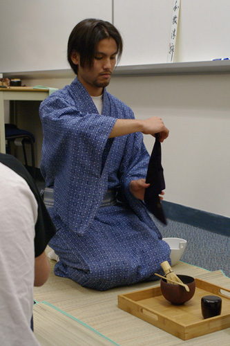 Our sensei (ごめん, I forget his name) is a student from the 和敬清寂 tea ceremony school. He started by giving us an introduction to the tea ceremony practice and explained the ideas of tranquility and peacefulness behind it. He said that tea ceremonies can go on for over four hours, but since it was already late at night, he graciously trimmed the time down to about 10 minutes. =)