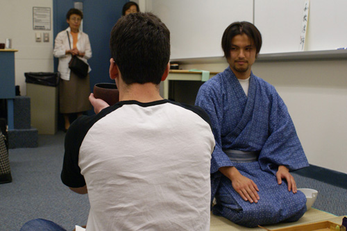 Anyway, last Tuesday in class we had a special tea ceremony presentation, or 茶道 as they call it in Japanese. It was actually very cool seeing how it was done. Obviously, we weren’t in an actual tea house nor were there nice tatami mats laid out, BUT we still managed to make do with with the crappy classroom setup (i.e. bolted tables).